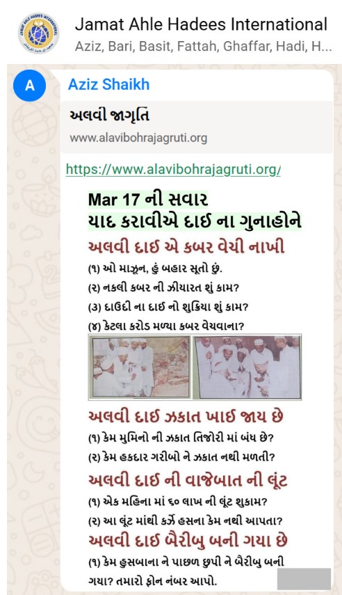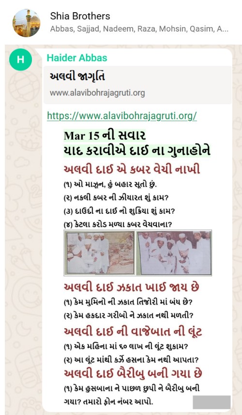 | 5 | | 4 - ભાઈ, અમે જે બીજી જમાત ના લોકો ને આમંત્રણ આપીયે છે એ મુસલમાન છે. અમે જે દાવત ના બુરા કામો અને ગુનાહો ને એમની જમાત માં ફેલાવા માંગીયે છે એ જમાત મુસલમાન હોવી જોઈએ તો જ એ લોકો સમજી શકે. આ વાણિયા ભાઈ કે સ્વામિનારાયણ ભાઈ ને શું સમજ પડે ઝકાત નું શું મહત્વ, દાઈ નું ફરઝ, દાઈ જમાત પર ઝુલ્મ અને લૂંટ ના કરી શકે, વિગેરે. આ ખાલી મુસલમાન જમાત જ સમજી શકે. તો આ વાણિયા ભાઈ કે સ્વામિનારાયણ ભાઈ અપને શું કામ લાગે? જો તમે સમજાવી શકો કે એ કામ લાગી શકે તો અમે એમને પણ screenshot મોકલીશું. - હુસેની |